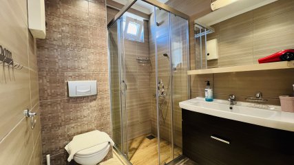 Wohnungsaufteilung 2+1: Eingangsbereich, Wohnzimmer, offene Küche, zwei Schlafzimmer, Badezimmer, Terrasse mit herrlichem Bergblick.