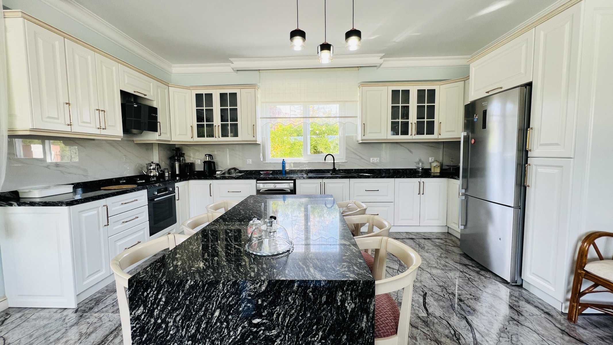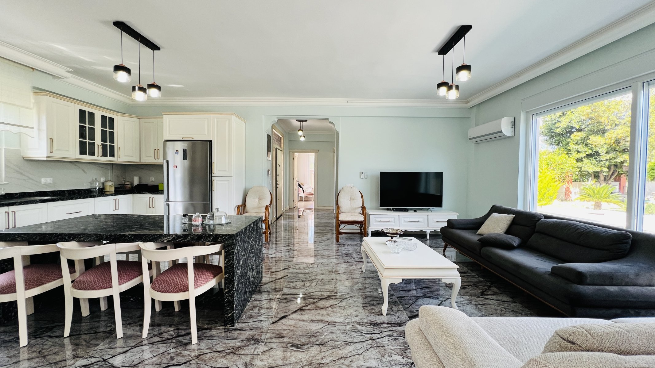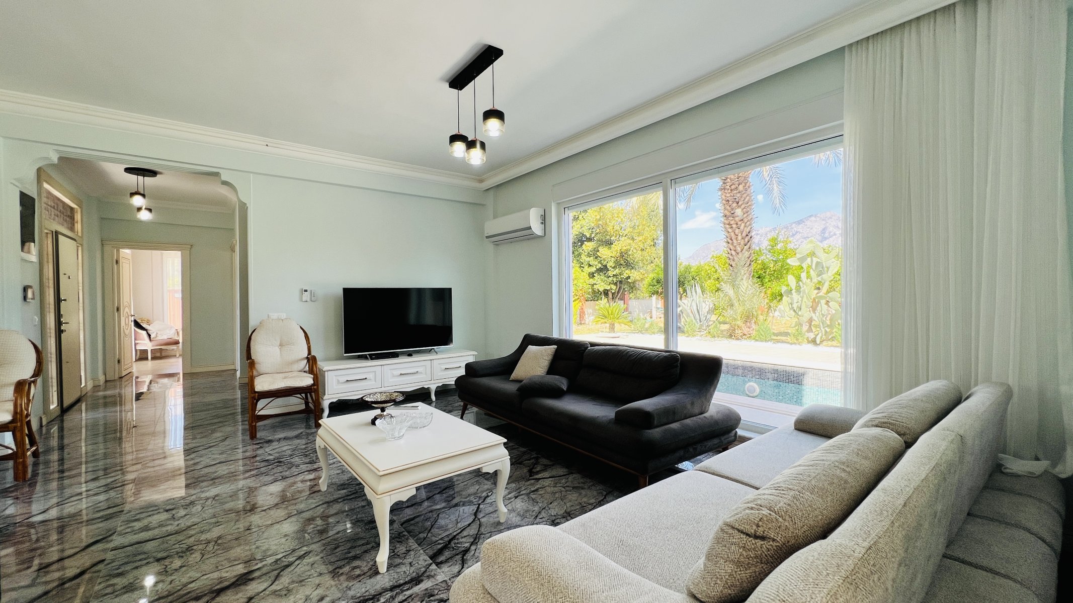 Unsere Villa in Kemer wird komplett möbliert vermietet und es wird keine zusätzliche Gebühr erhoben. Es handelt sich um einen komfortablen Wohnraum, der für Großfamilien geeignet ist.