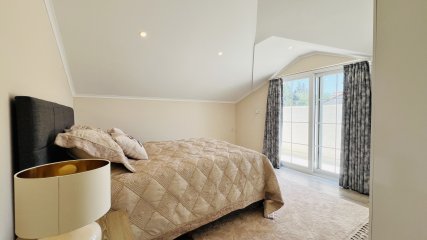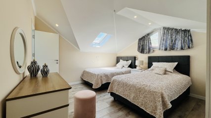 Das erste Schlafzimmer ist geräumig, wunderschön dekoriert, verfügt über ein eigenes Bad und ein Fenster mit Bergblick.
