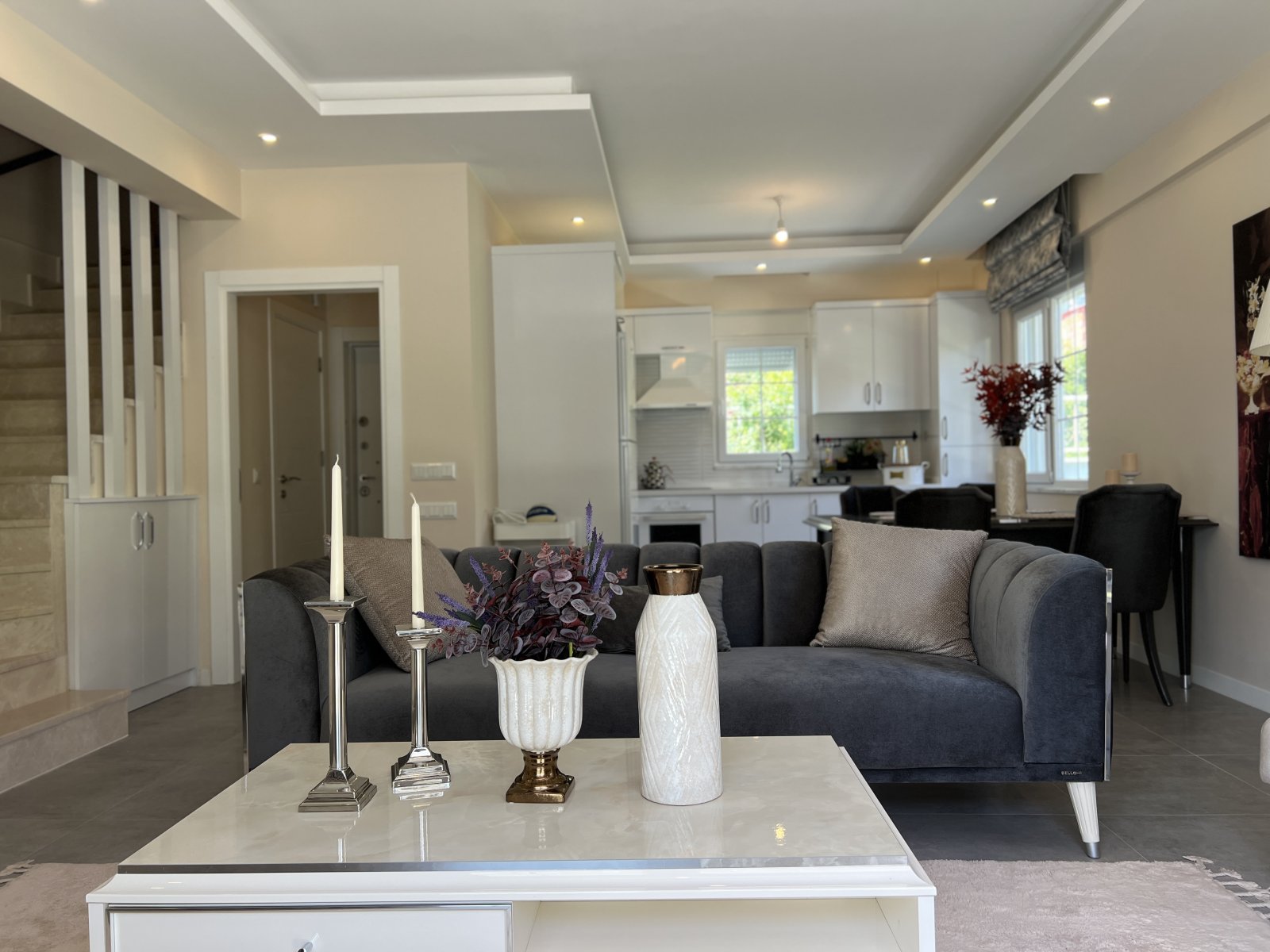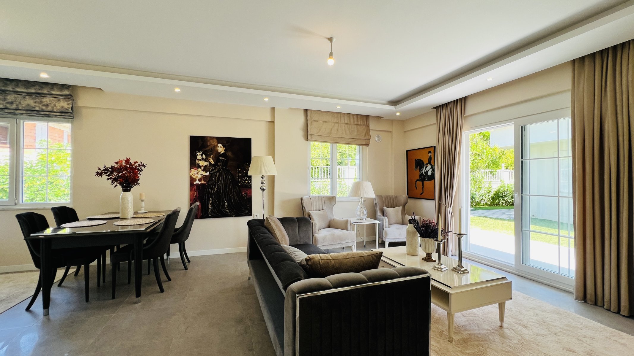 Im Erdgeschoss gibt es eine großzügige Terrasse, eine offene amerikanische Küche und ein stilvoll eingerichtetes Wohnzimmer mit Blick auf den grünen Garten und den blauen Pool.