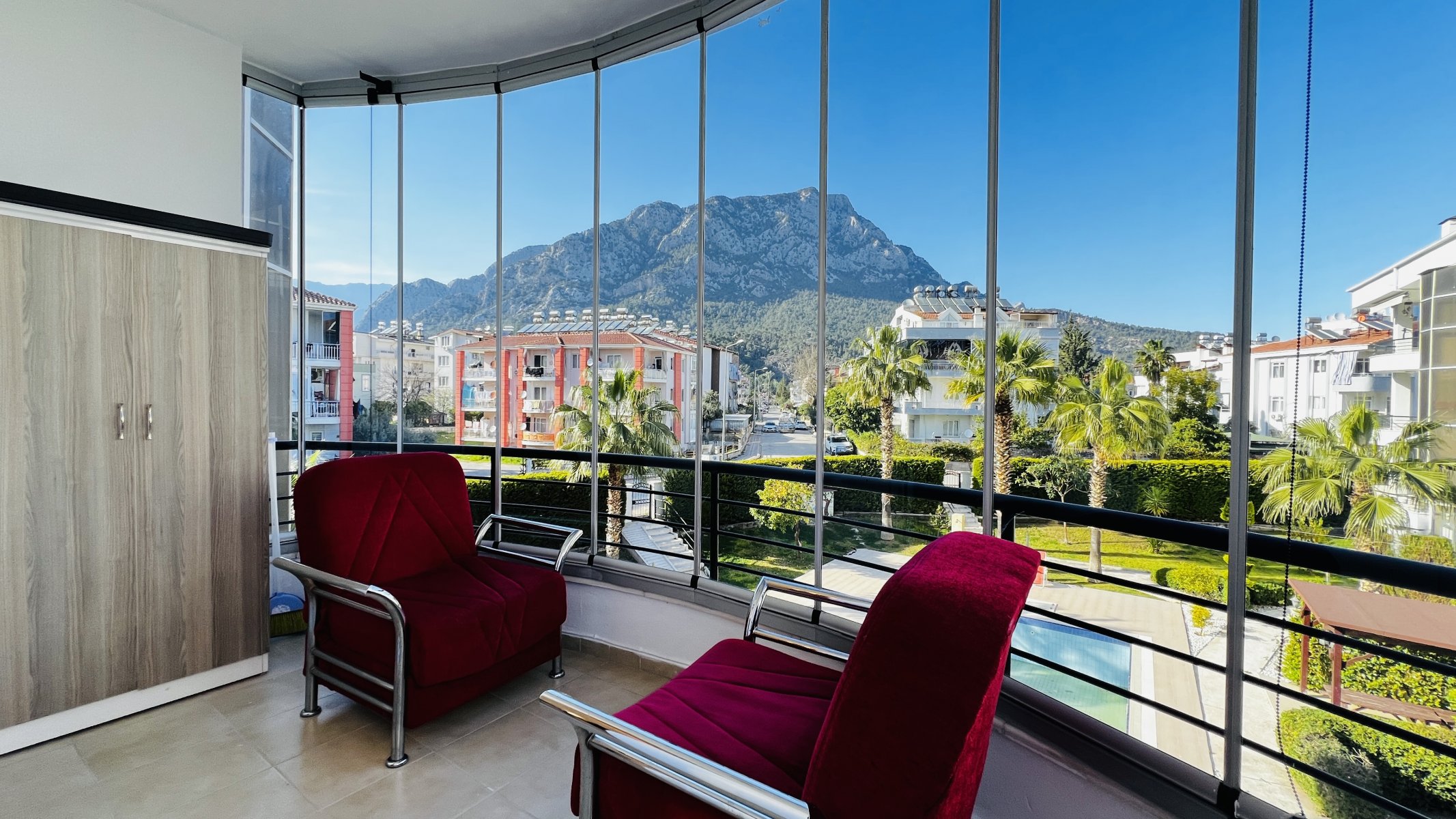 The complex offers a swimming pool, security camera system, internet, bicycle parking area, barbecue area, and a magnificent mountain view.