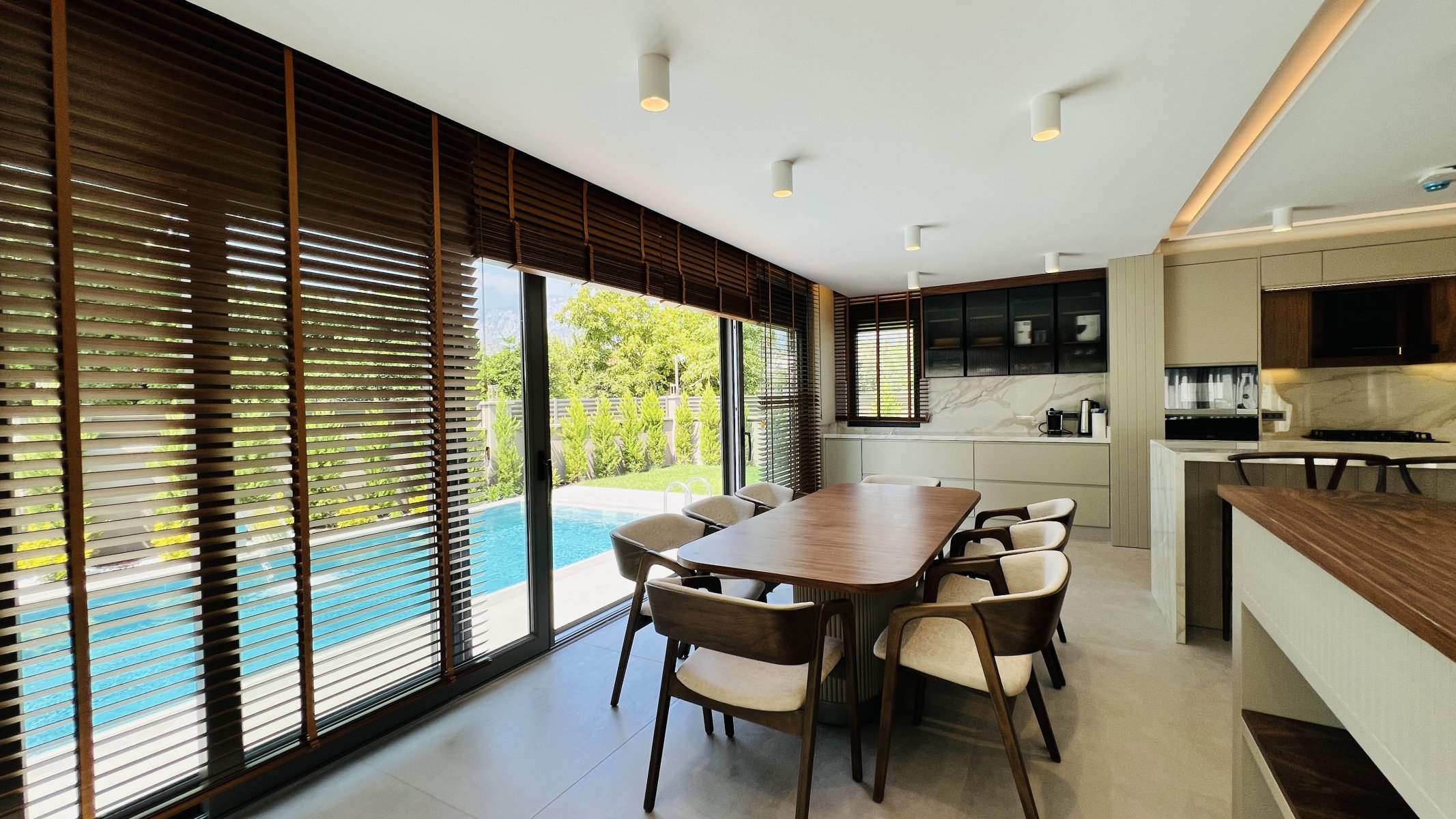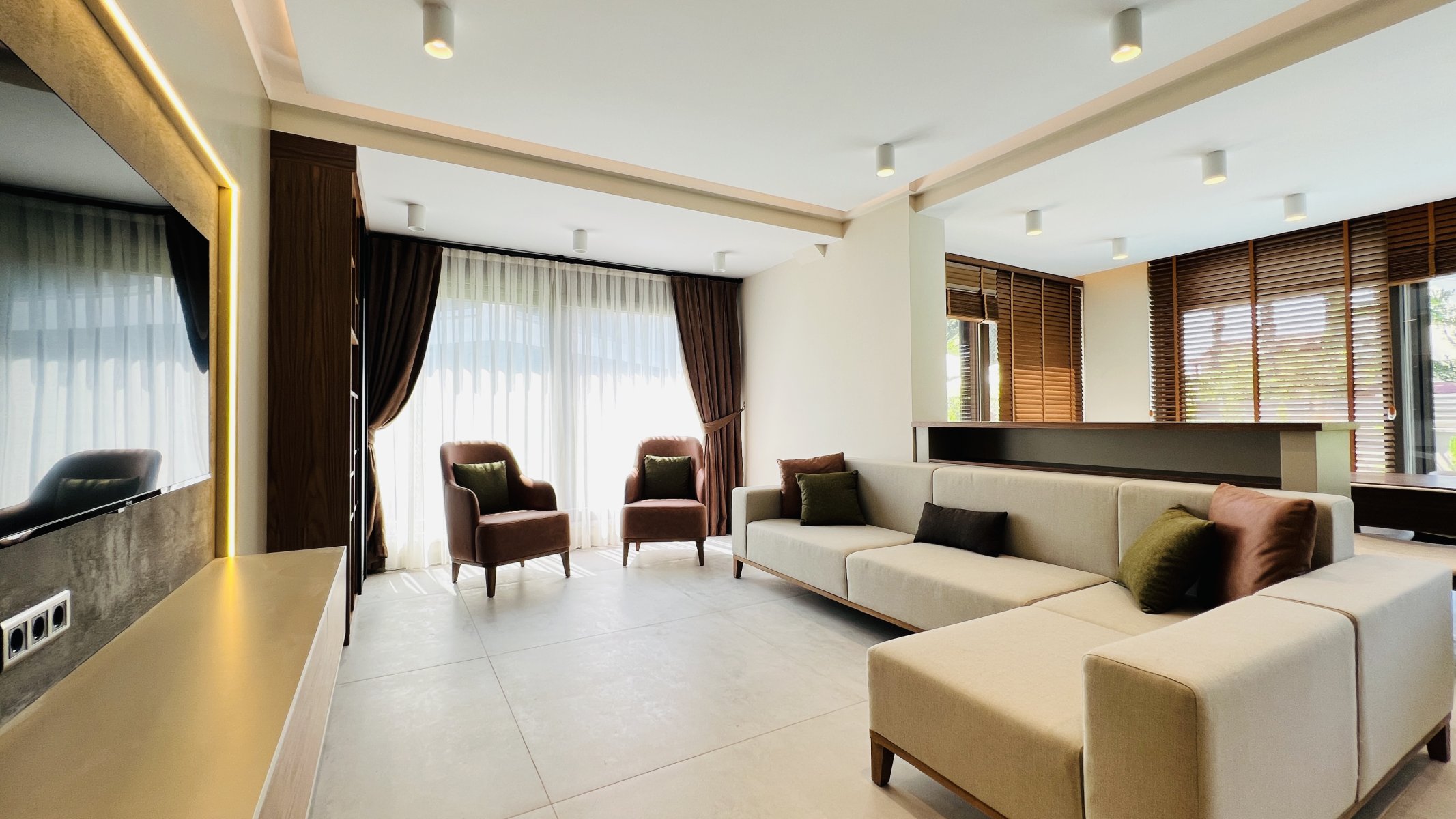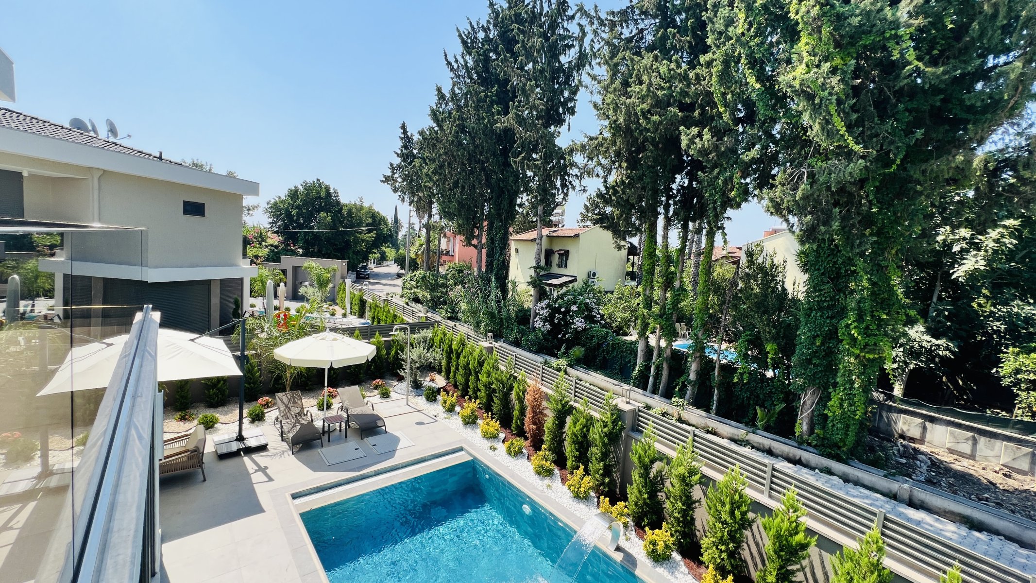 Denne frittstående villaen på en tomt på 350 m² i Çamyuva-området i Kemer skiller seg ut med sin moderne arkitektur og gjennomtenkte planløsning.