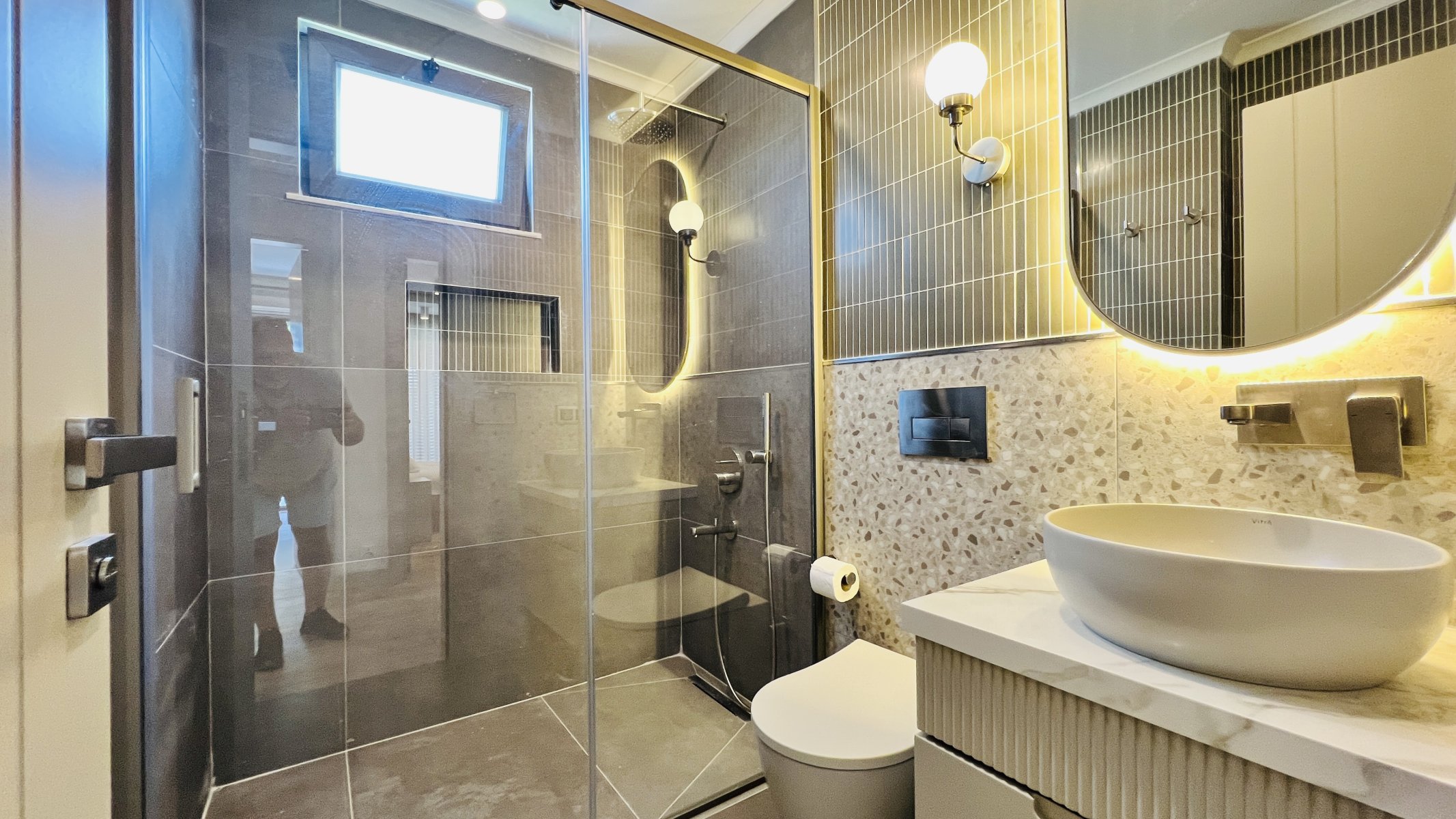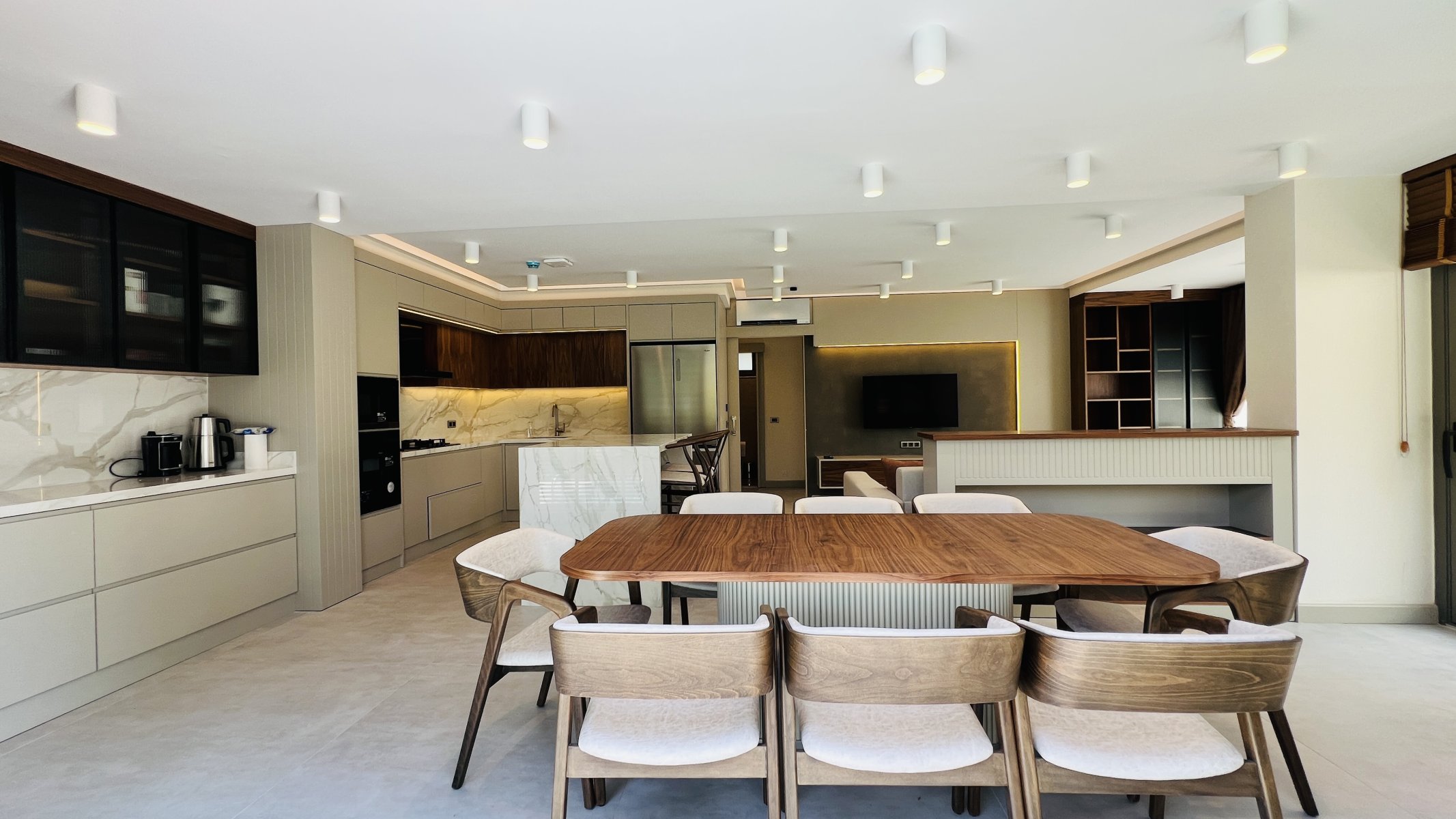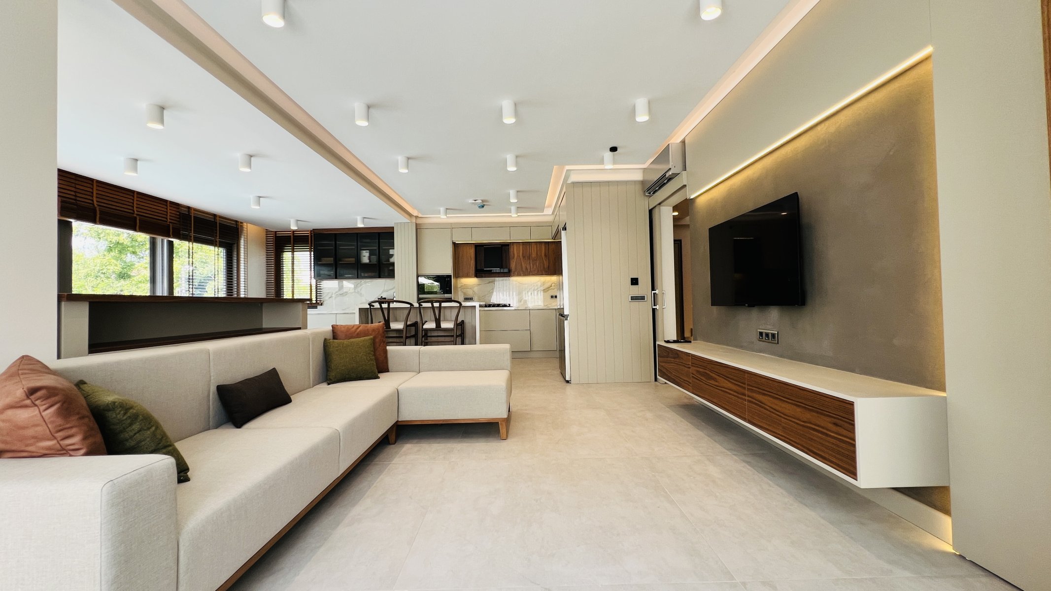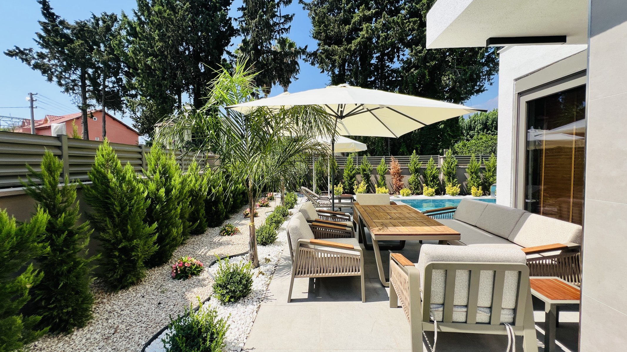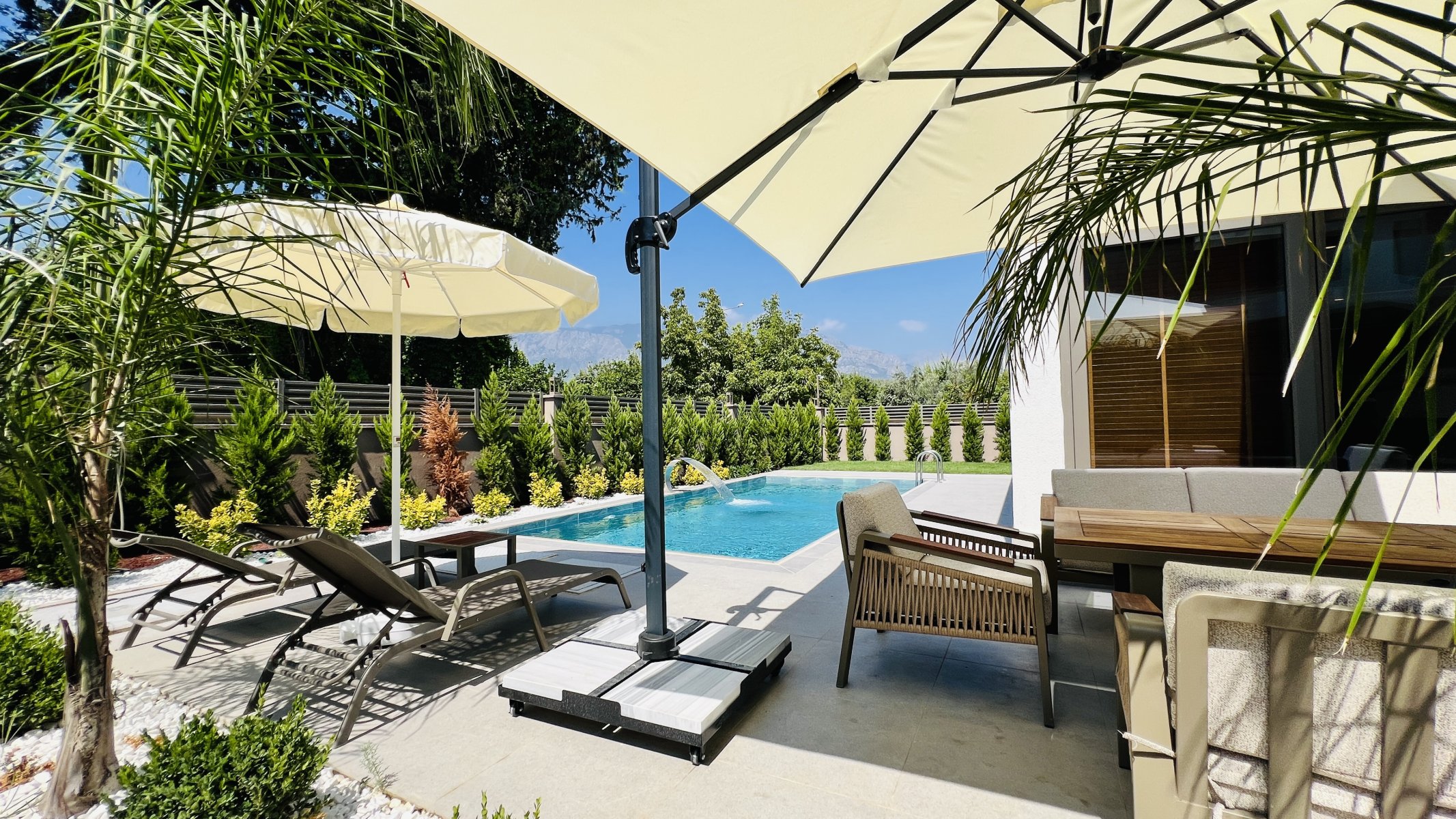Hver detalj er nøye gjennomtenkt, og hver krok utnyttes med praktiske lagringsløsninger. Oppholdsrommet som smelter sammen med hagen, tilbyr en fredelig atmosfære med fantastisk utsikt over Taurusfjellene.