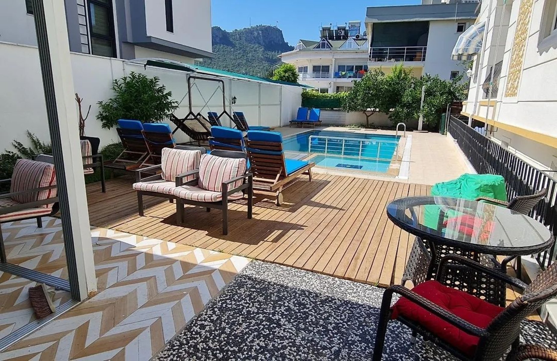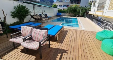 Kemer Merkez’de, denize 550 metre mesafede, yarı bodrum kat komple eşyalı daire kiralıktır. 45 m² kullanım alanına sahip dairede, güneşli günlerde keyif yapabileceğiniz tenteli balkon bulunuyor. Site, yüzme havuzu gibi sosyal olanaklar sunmakta ve kira bedeline su, internet ve aidat dahildir.