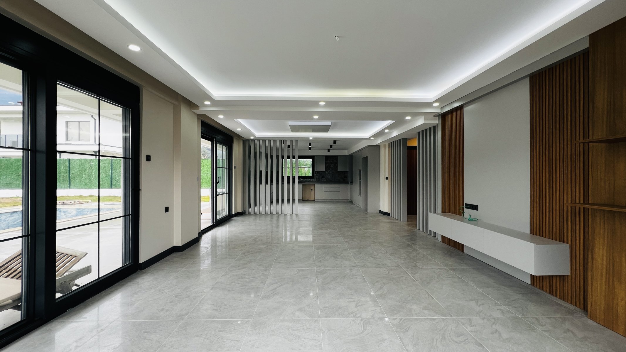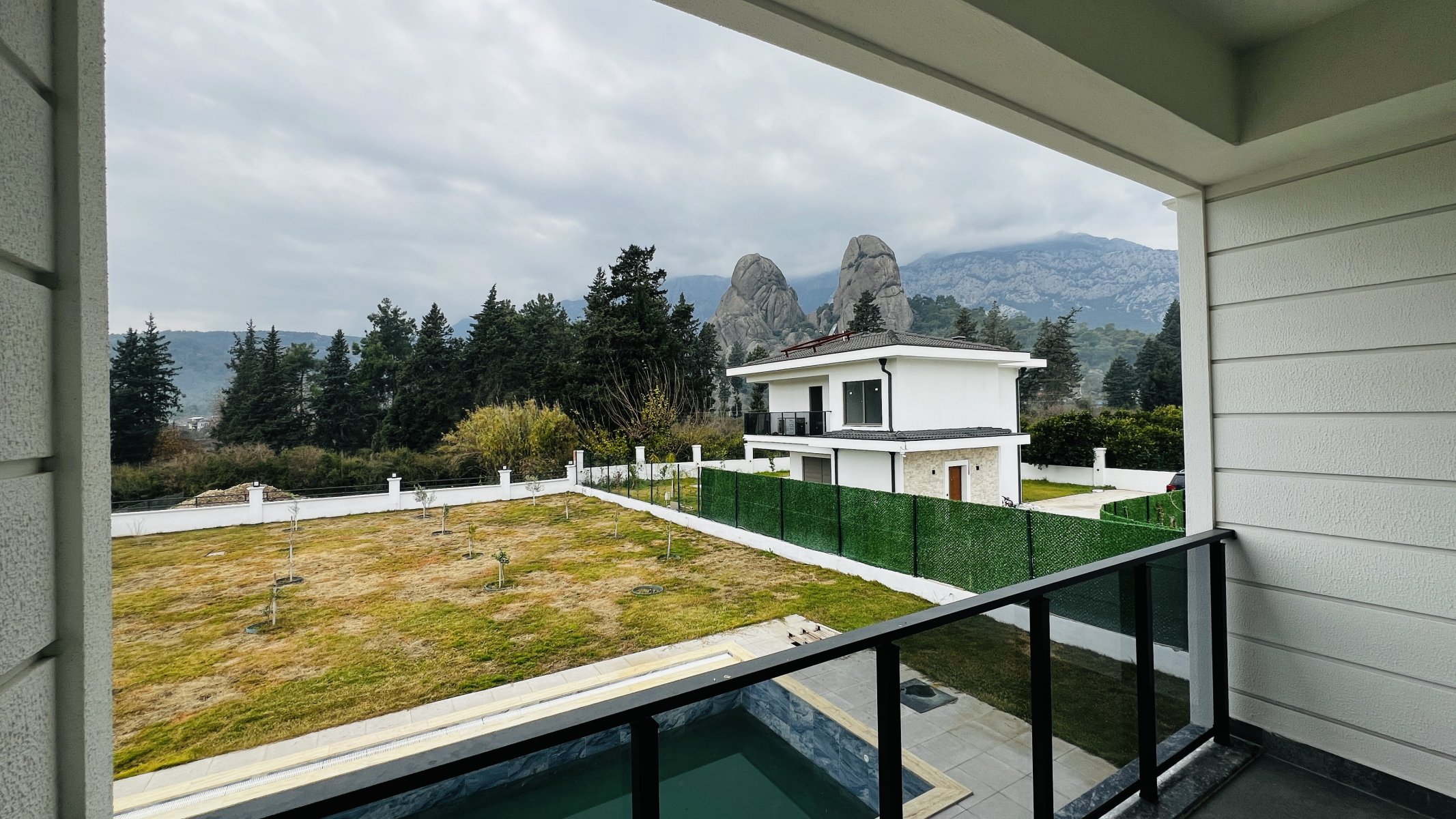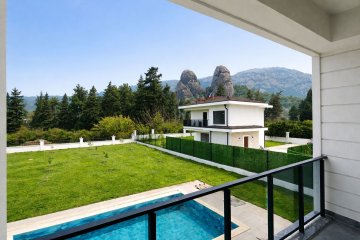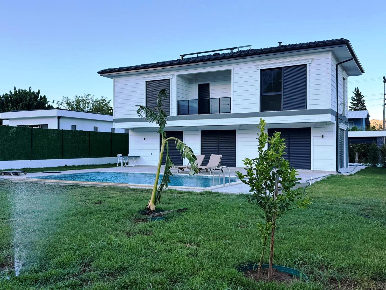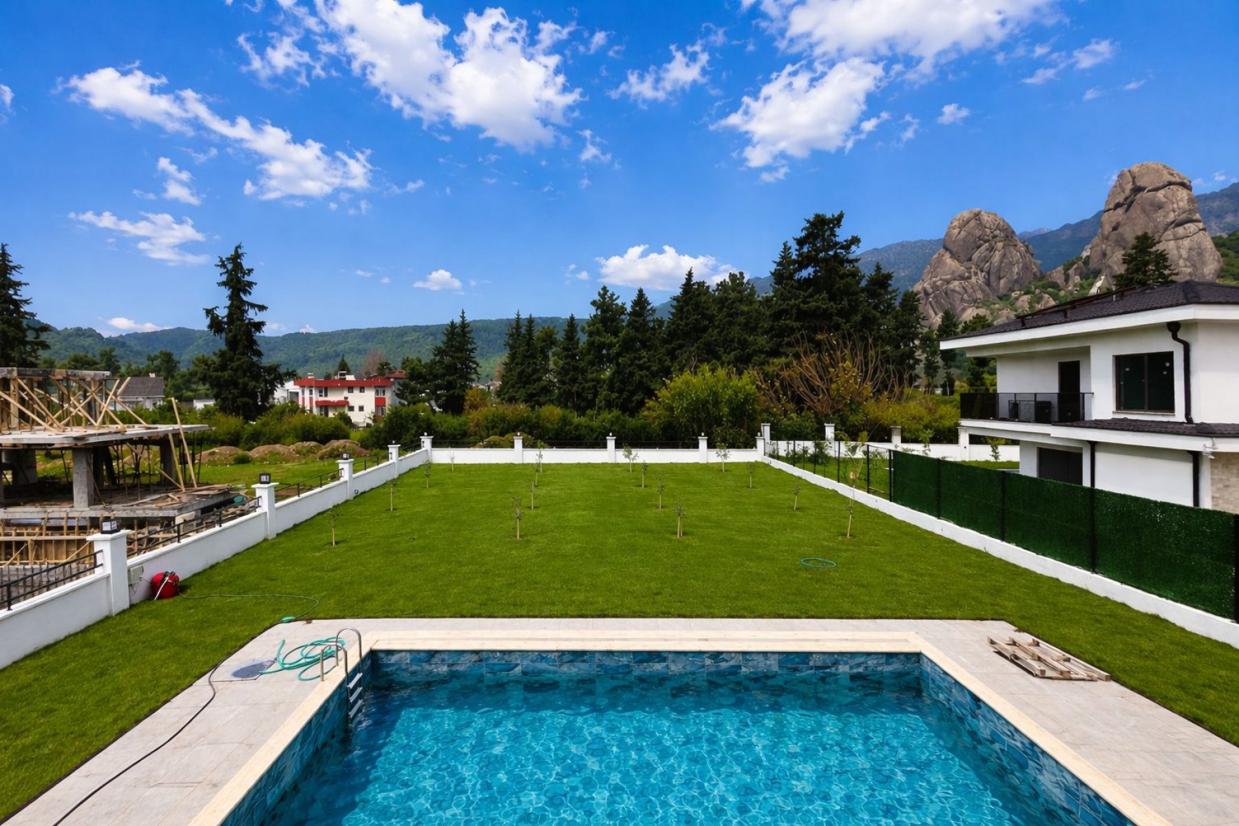 Villa arazisinde özel yüzme havuzu ve araç park alanı yer almaktadır. Geniş arsa, bahçe ve dinlenme alanları oluşturmak için önemli bir avantaj sunmaktadır.