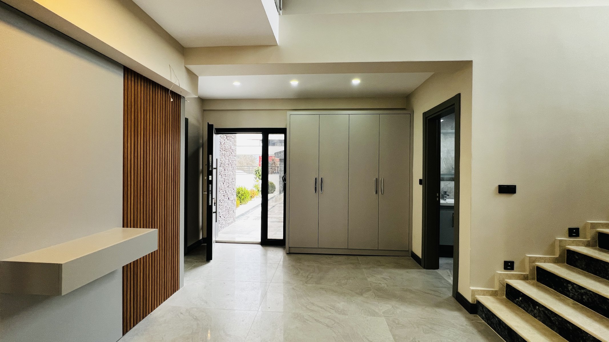 Zemin kat: Açık plan mutfak ve geniş, aydınlık salon ferah bir yaşam alanı sunmaktadır. Bu katta, kendi banyosuna sahip bir yatak odası ve ayrıca ortak kullanım için bir banyo yer almaktadır. Geniş hol ve geniş teras muhteşem manzaraya açılmaktadır.