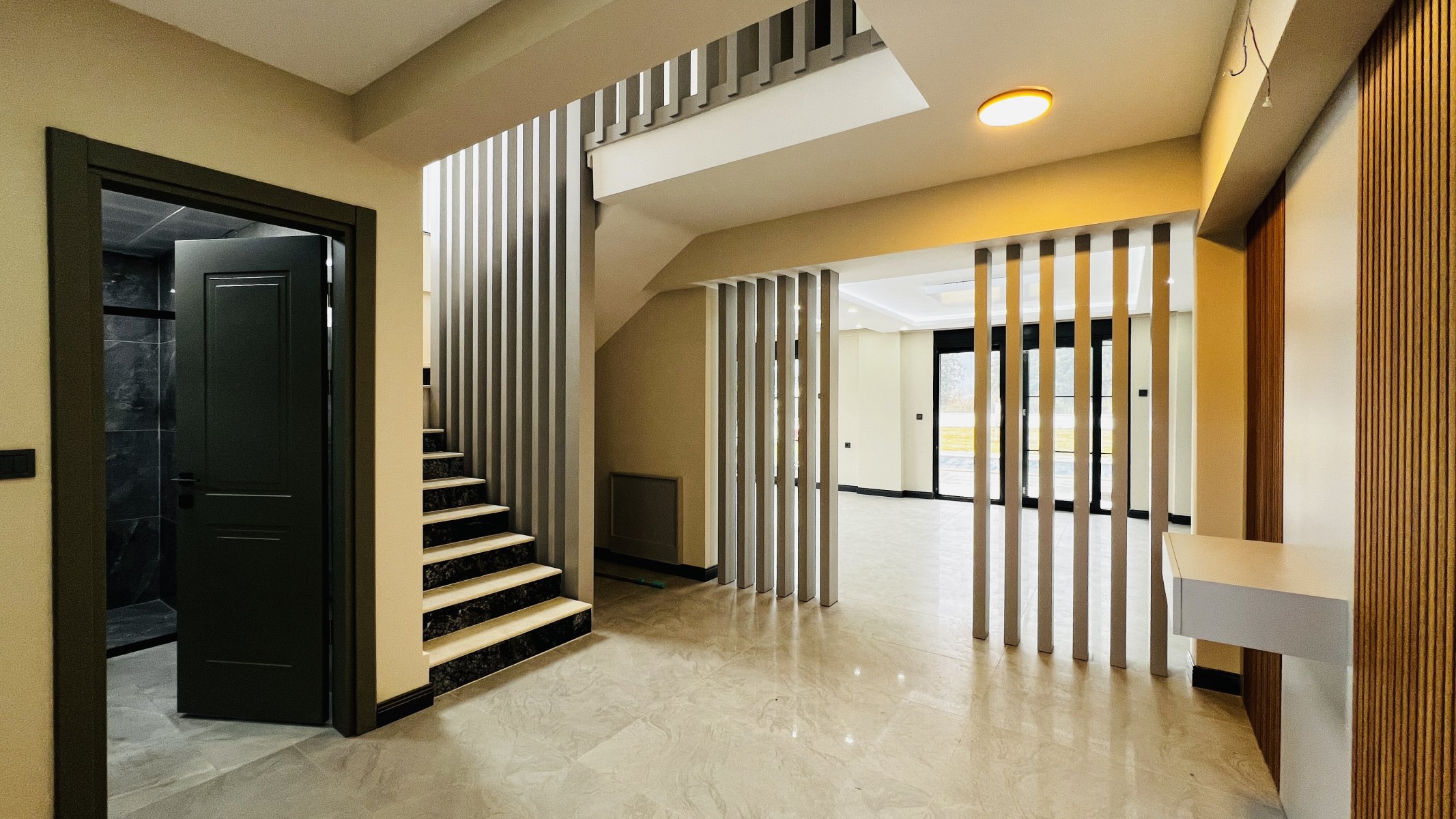 Üst kat: Üst katta üç yatak odası bulunmaktadır. Ebeveyn yatak odası, özel banyosu ve giyinme odasıyla master alan olarak tasarlanmıştır. Ayrıca ortak banyo ve gömme dolaplı, çok amaçlı bir oda mevcuttur.