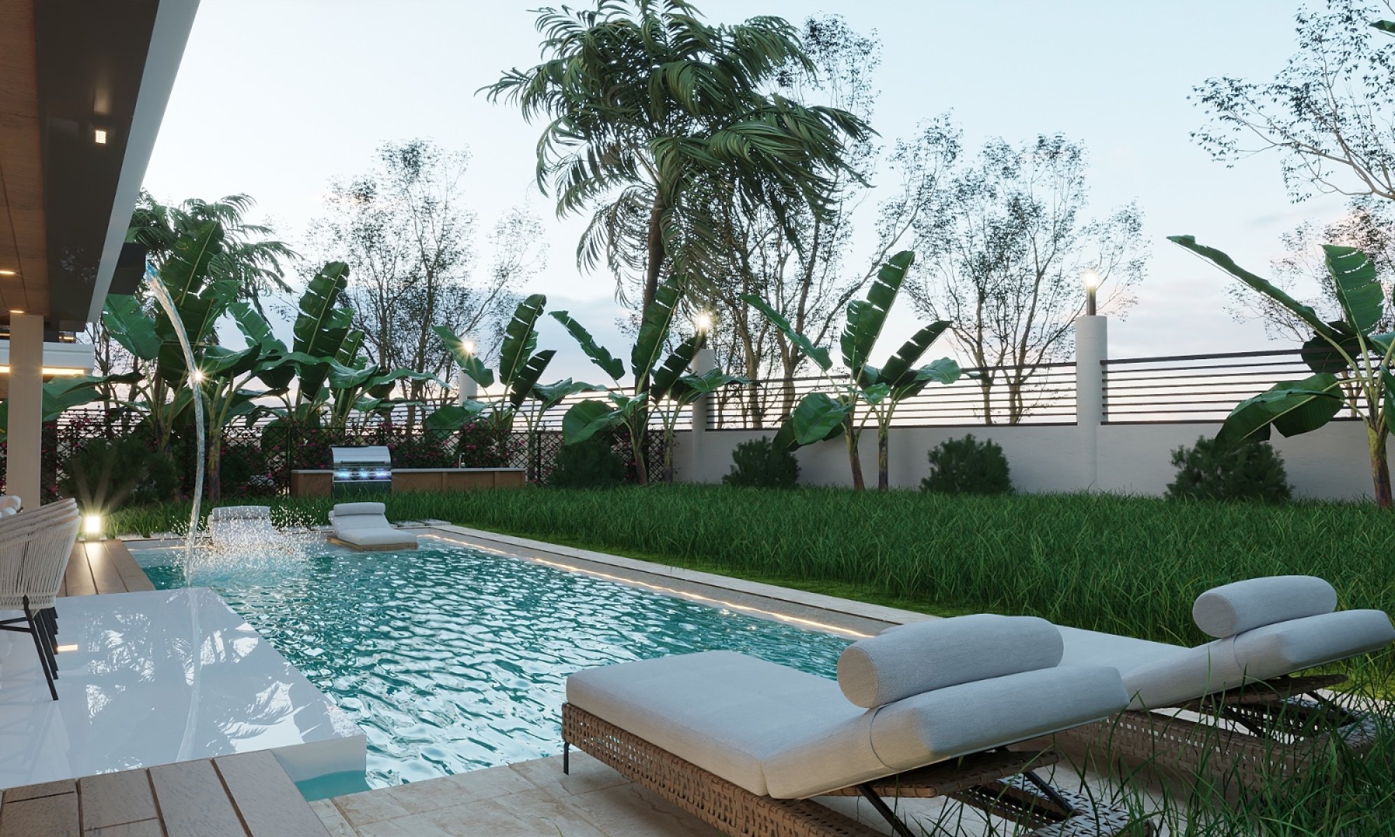Villanın giriş katında geniş bir salon ve modern açık plan mutfaktan oluşan ferah bir yaşam alanı bulunmaktadır. Büyük pencereler sayesinde iç mekân gün boyu aydınlıktır. 45 m² genişliğinde terastan doğrudan bahçeye çıkış bulunmaktadır. Şelale efektine sahip özel yüzme havuzu bulunmakkta olup adeta özel bir tatil köyü atmosferi sunmaktadır. Bu katta ayrıca bir yatak odası ve misafir banyosu yer almaktadır.