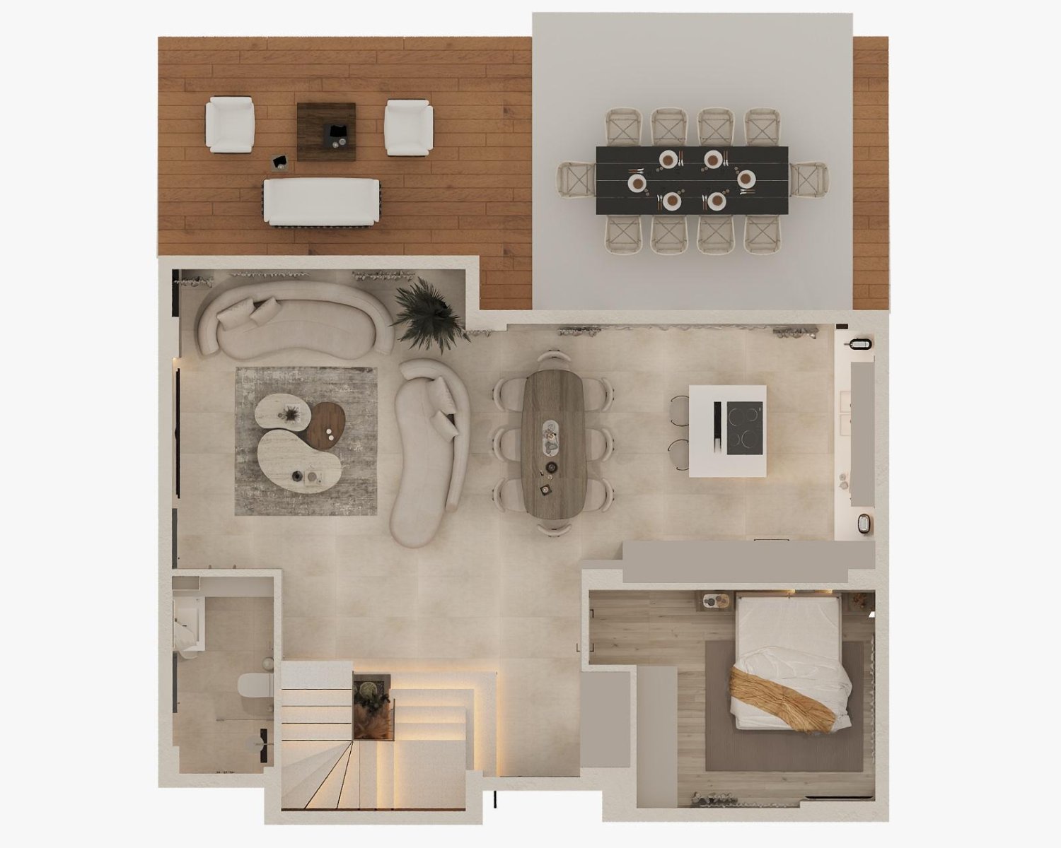 Üst kat özel yaşam alanı olarak tasarlanmıştır. Burada yer alan geniş yatak odalarının her biri kendine ait banyoya sahiptir. Ebeveyn yatak odasında ayrıca giyinme odası bulunmaktadır. Yüksek kaliteli ısı ve ses yalıtımı sayesinde odalar sessiz ve konforludur. Balkonlardan ve pencerelerden dağlara ve çevredeki doğal güzelliklere hâkim etkileyici manzaralar izlenebilmekte, bu da huzur ve mahremiyet hissi yaratmaktadır. Bu katta ayrıca bir çamaşır odası mevcuttur.