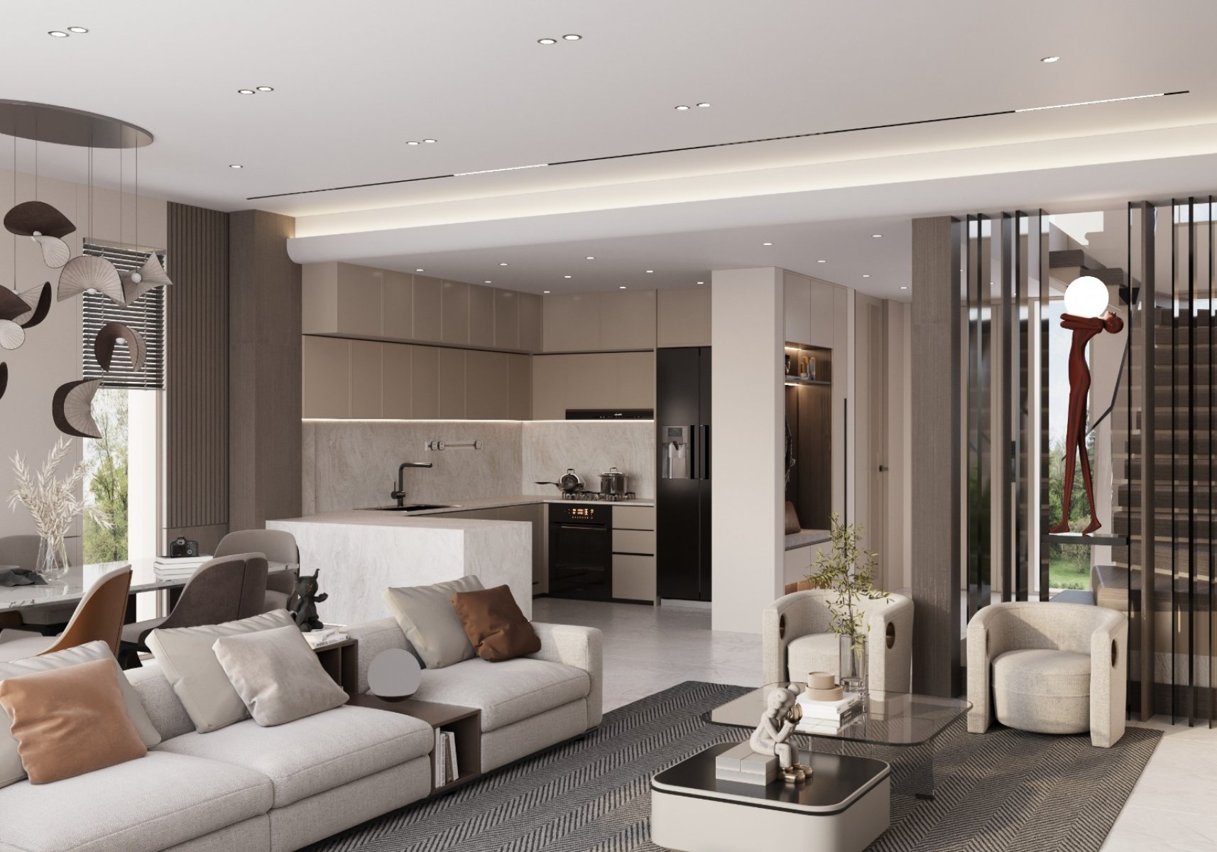 Giriş katında açık mutfak ile birleşen geniş bir salon, misafir tuvaleti ve geniş bir teras bulunmaktadır.