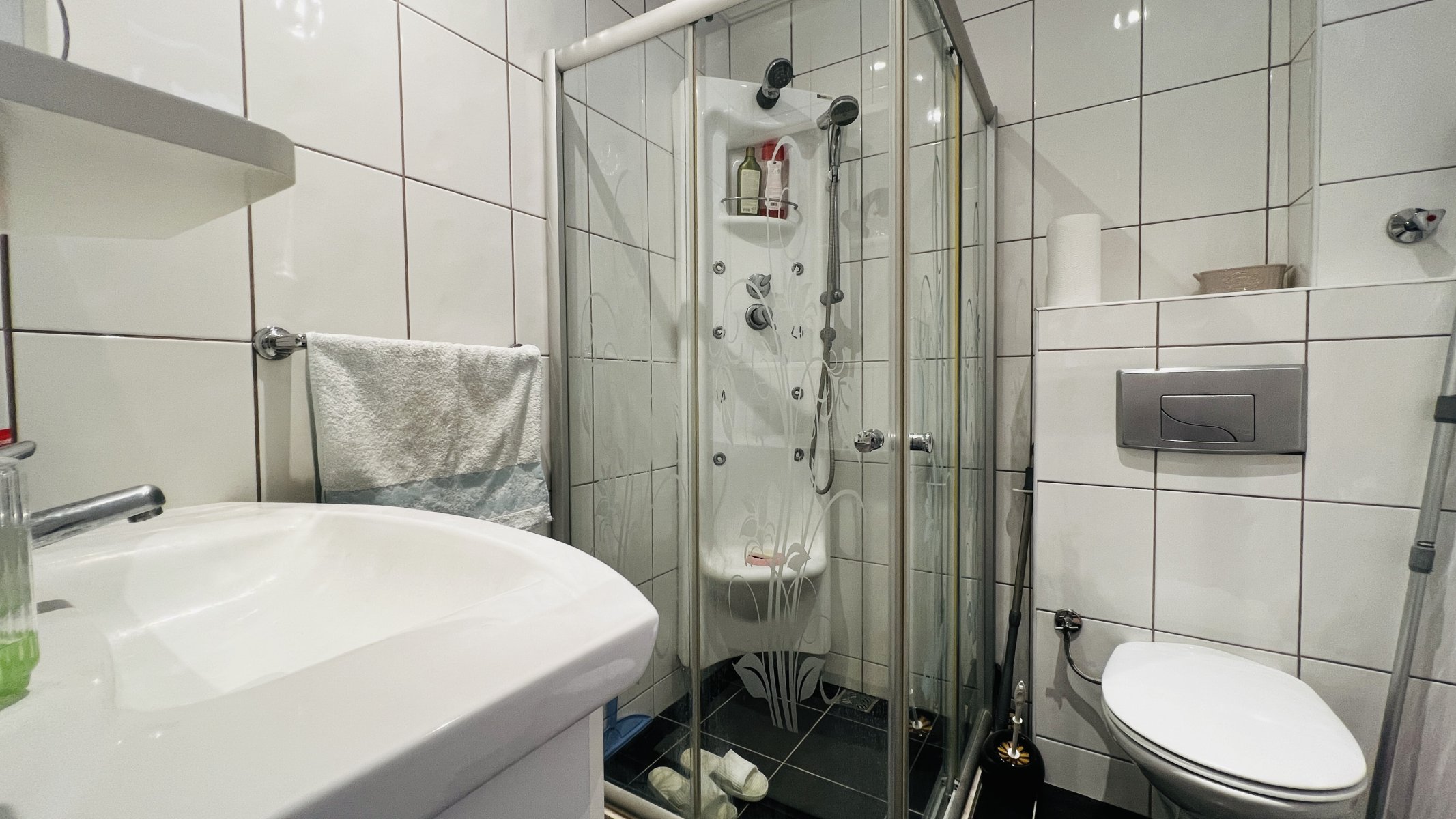 The apartment is offered for sale fully furnished and designed as a duplex. On the first floor, there is a spacious living room, an open-plan kitchen, one bathroom with WC, and one bedroom with a balcony. The second floor features three bedrooms, three balconies, and one shared bathroom with WC. The total usable area of the apartment is 124 m² and it is located within a residential complex.