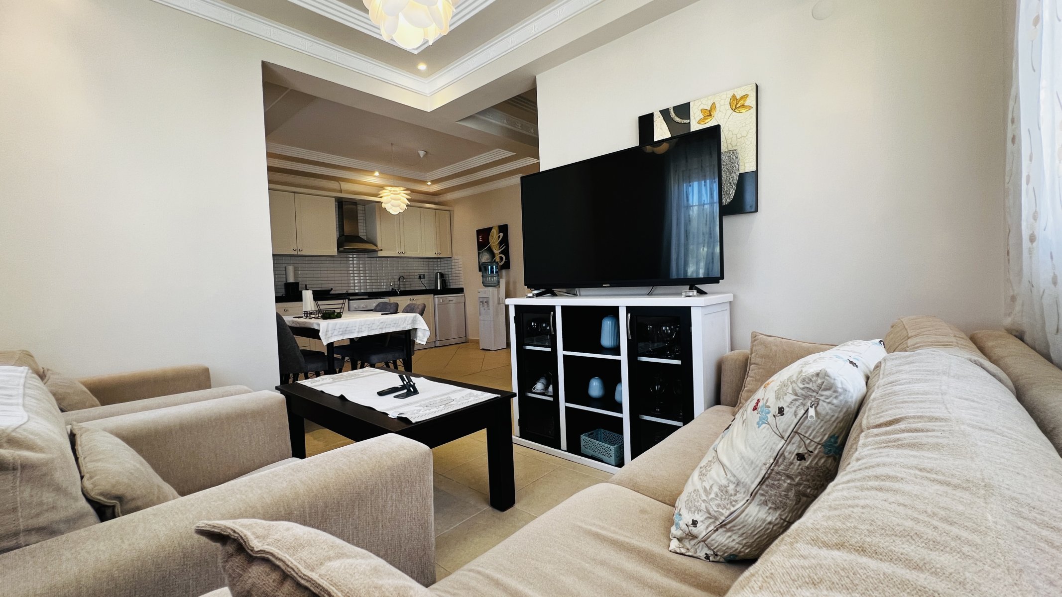 The complex is built on a total land area of 1,270 m² and offers an outdoor swimming pool, bicycle parking area, barbecue area, and breathtaking mountain views. Thanks to its central location, the apartment is 1,300 meters from the sea, 250 meters from shopping centers, and approximately 60 km from Antalya International Airport.