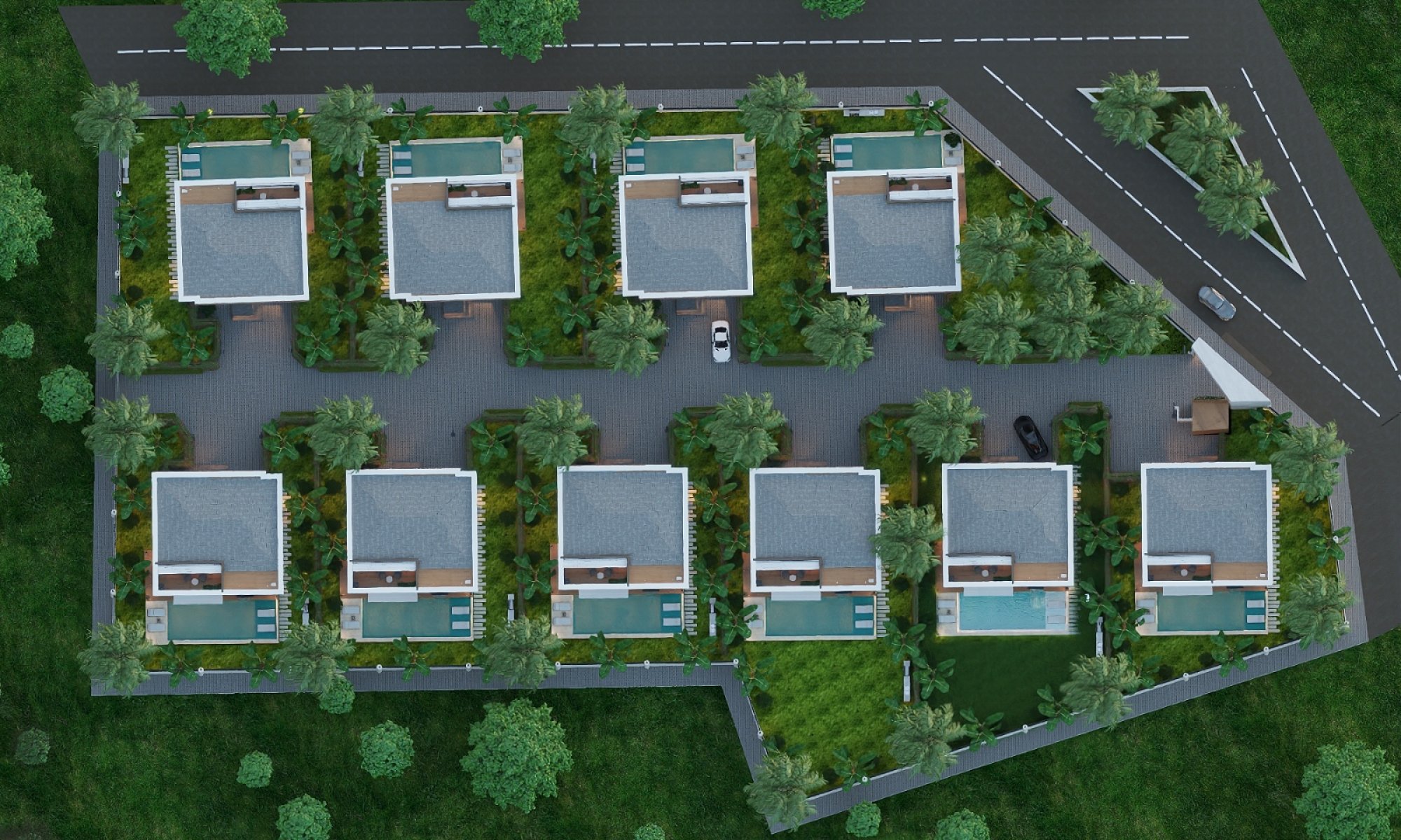 The surrounding area is professionally landscaped with a well-maintained garden and an automatic irrigation system. There is private parking for two vehicles. The property is covered by 24/7 service and maintenance, ensuring maximum comfort.