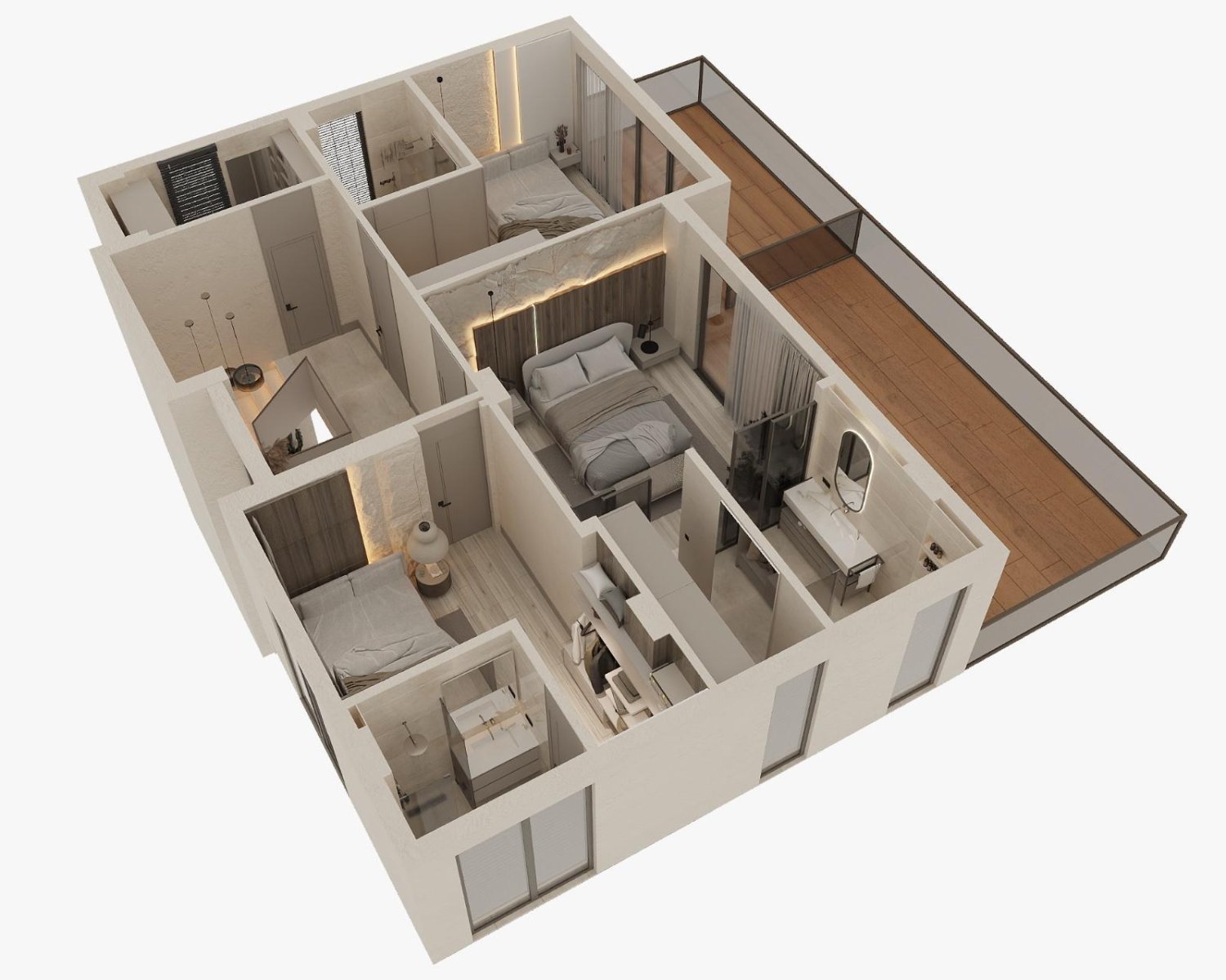 The upper floor is designed as a private living area. Each of the spacious bedrooms has its own en-suite bathroom. The master bedroom also features a walk-in dressing room. High-quality thermal and sound insulation ensures a quiet and comfortable living environment. From the balconies and windows, stunning views of the mountains and surrounding nature can be enjoyed, providing a sense of peace and privacy. A laundry room is also available on this floor.