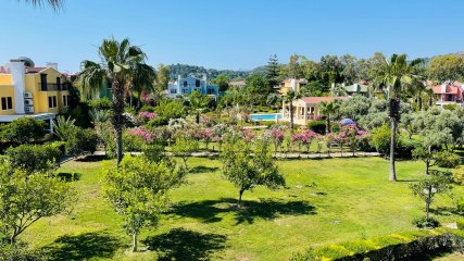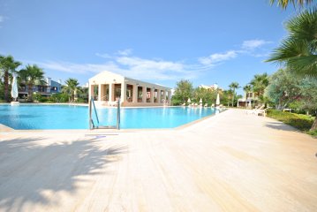The layout of the villa is thoughtfully designed: on the ground floor, there is a spacious living room combined with a kitchen, with access to a cozy terrace, as well as a guest toilet. The second floor features two bright bedrooms and a bathroom. The top floor is dedicated to a master bedroom with its own bathroom and terrace. From this terrace, there are impressive views of the complex and the Taurus Mountains, creating a special atmosphere of peace and tranquility.