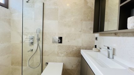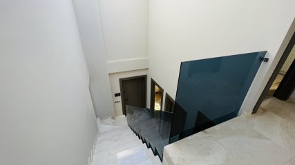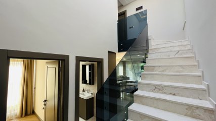 На двух этажах виллы есть подогрев полов, в каждой комнате установлены кондиционеры, на кухне встроенные вытяжка - варочная панель - духовой шкаф - микроволная печь - посудомоечная машина, установлены электрические роль - ставни на окнах, видеодомофон.
