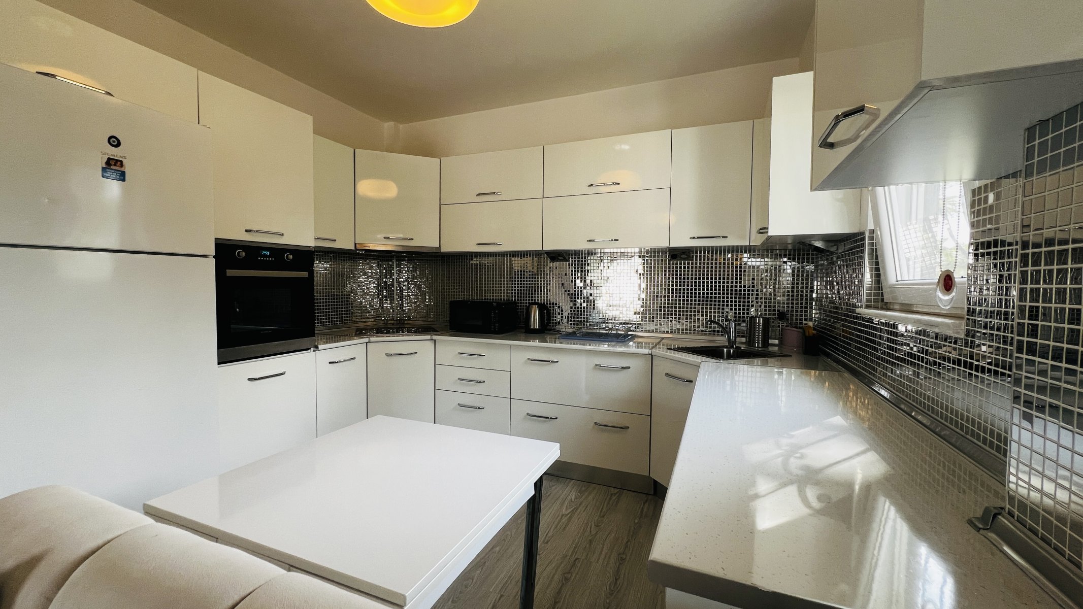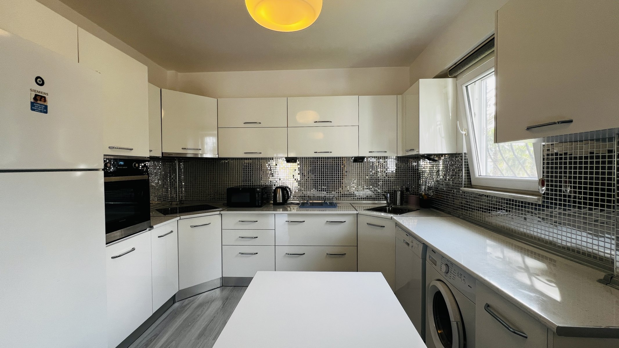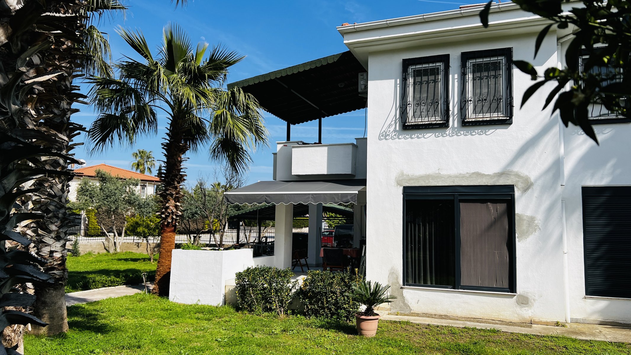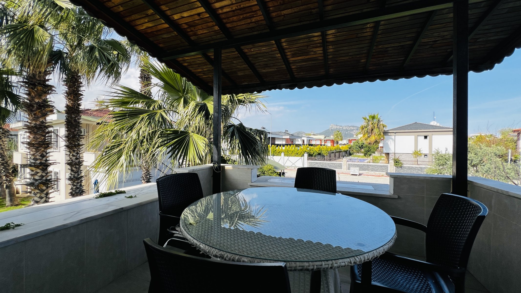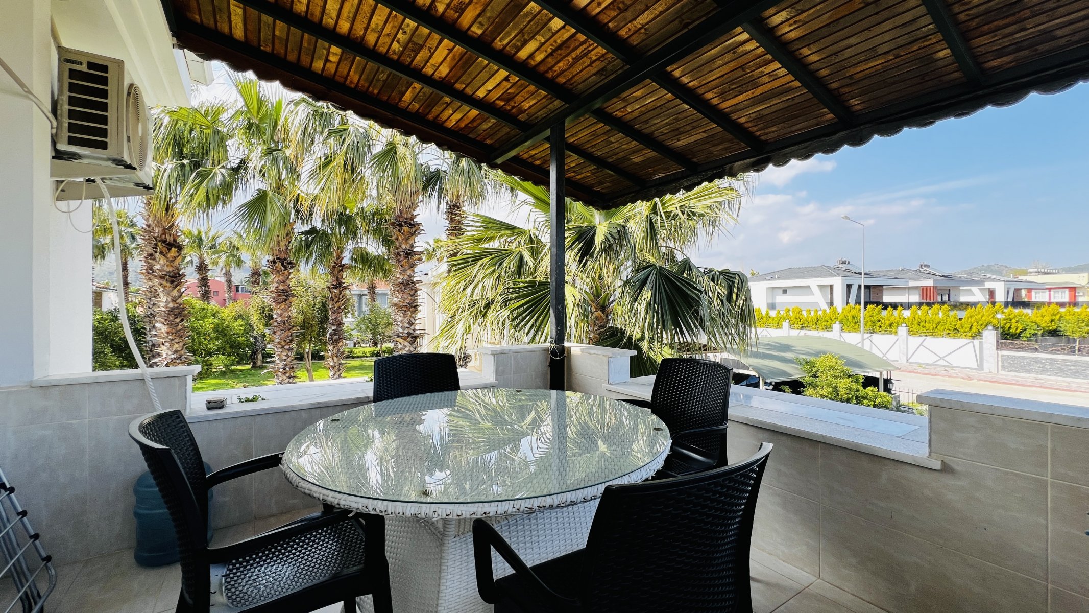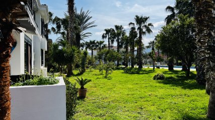 Квартира находится на территории ухоженного жилого комплекса площадью 6.633 м², где всего 24 квартиры размещены в двухэтажных блоках с небольшим количеством соседей. Такое планировочное решение создаёт ощущение уединённости и комфорта. У каждой квартиры предусмотрен отдельный вход и парковочное место, а на территории расположен общий бассейн, окружённый зеленью.