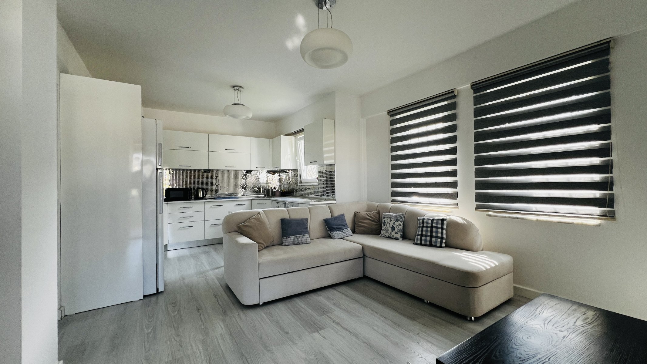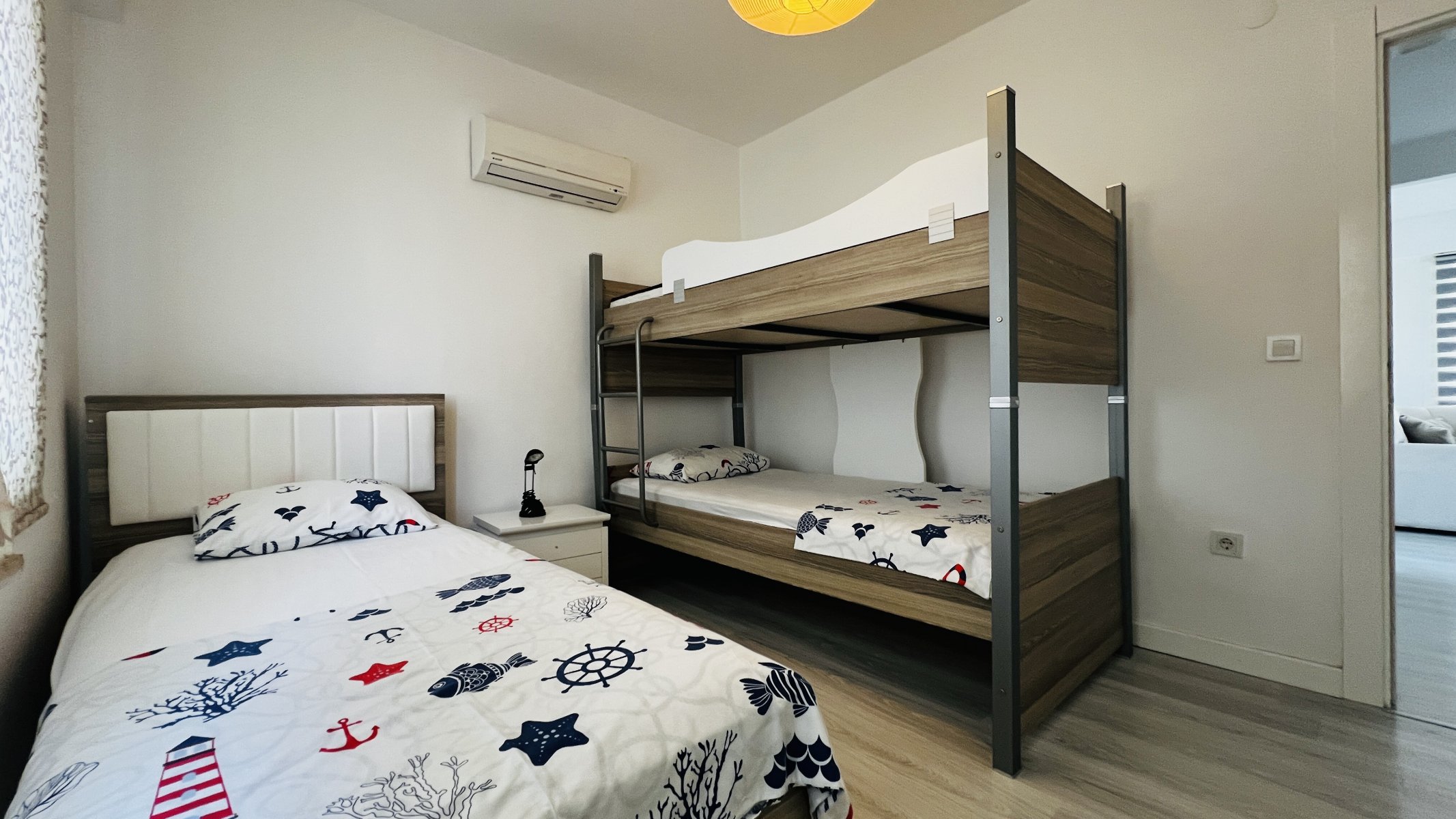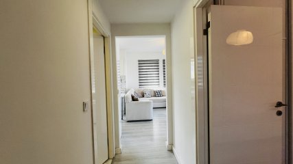 Квартира на продажу расположена на втором этаже и имеет общую площадь 80 м². Внутреннее пространство продумано для комфортного проживания: при входе открывается гостиная с кухней открытого типа, далее расположены две спальные комнаты и ванная. Особое внимание привлекает просторная терраса с приятным видом на сад, где можно отдыхать и проводить время на свежем воздухе.